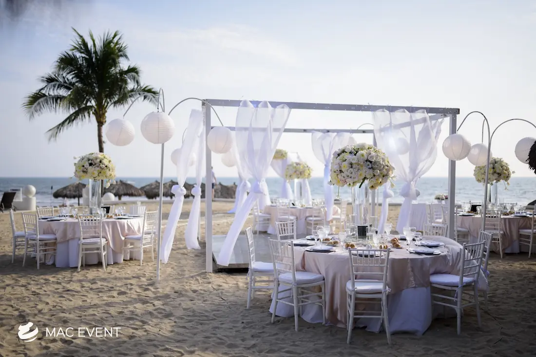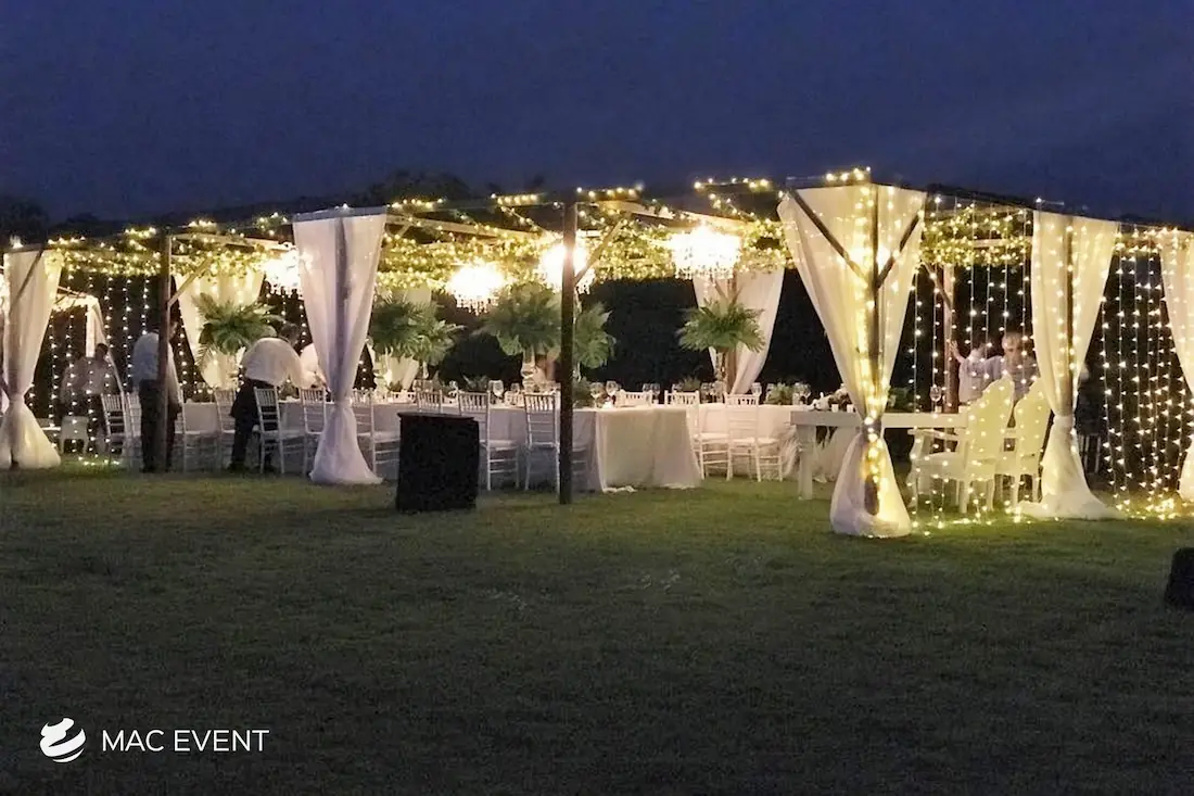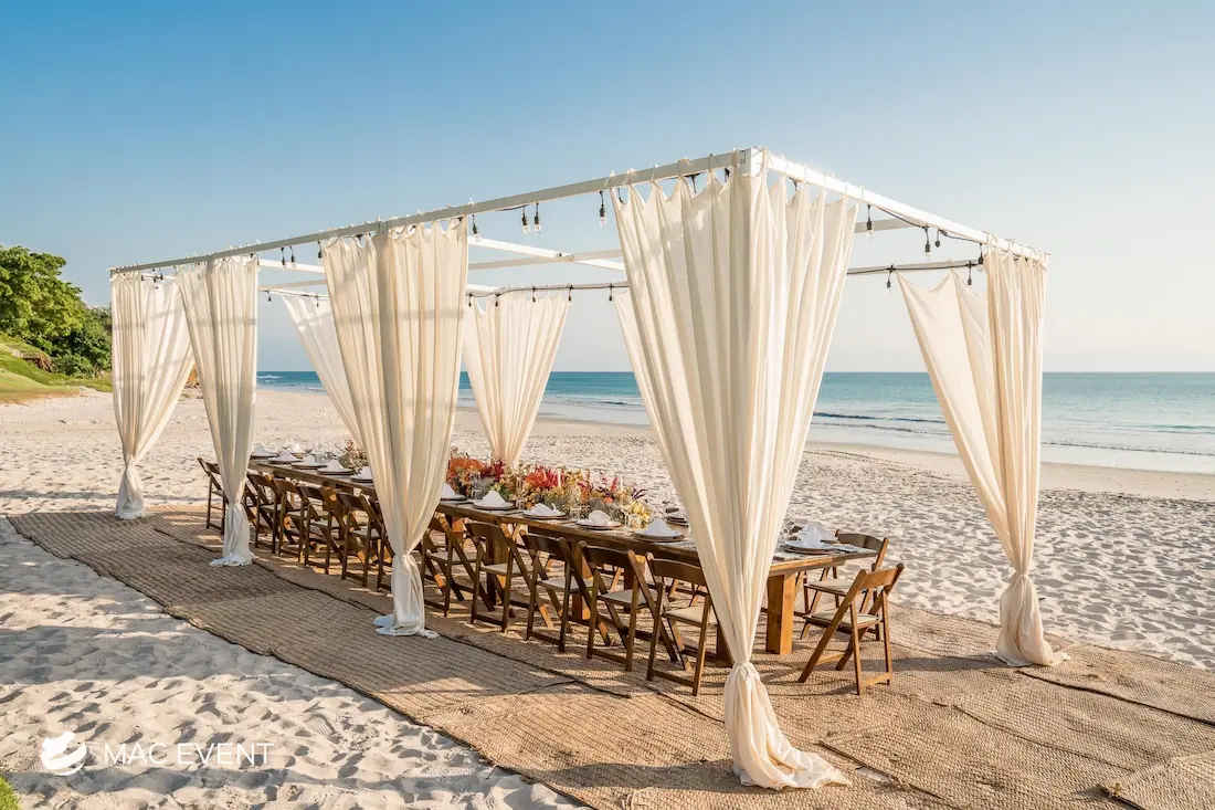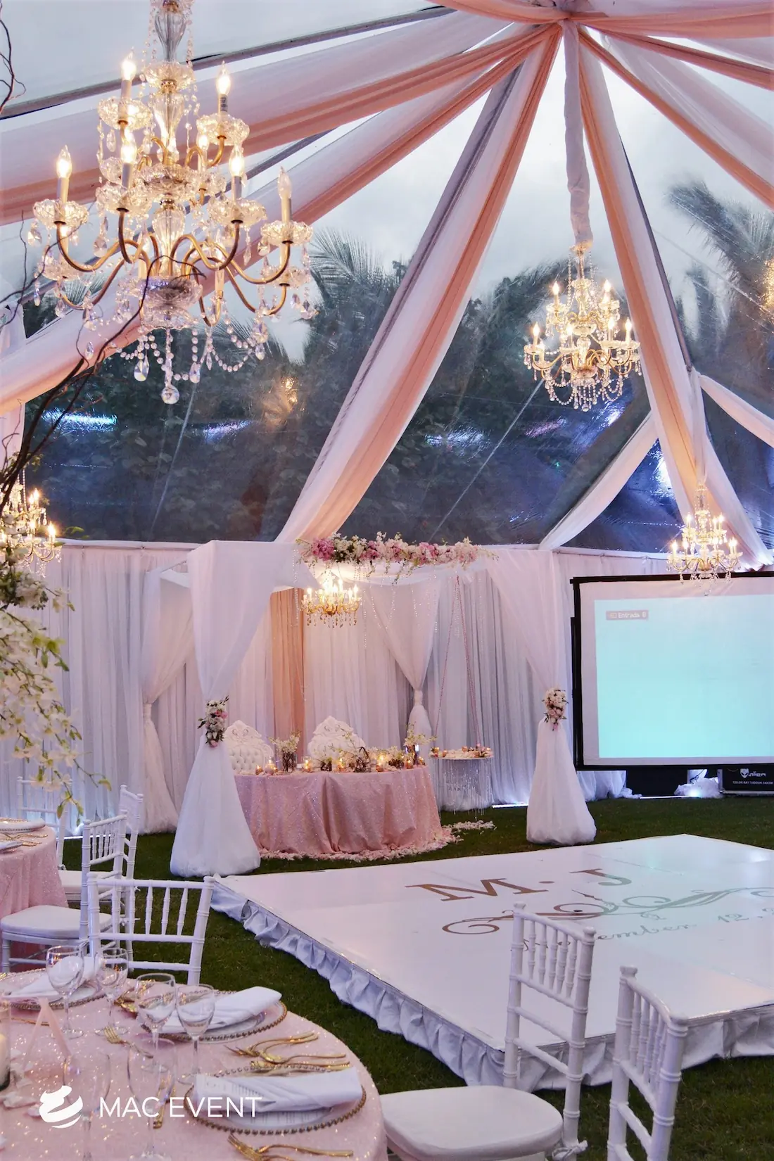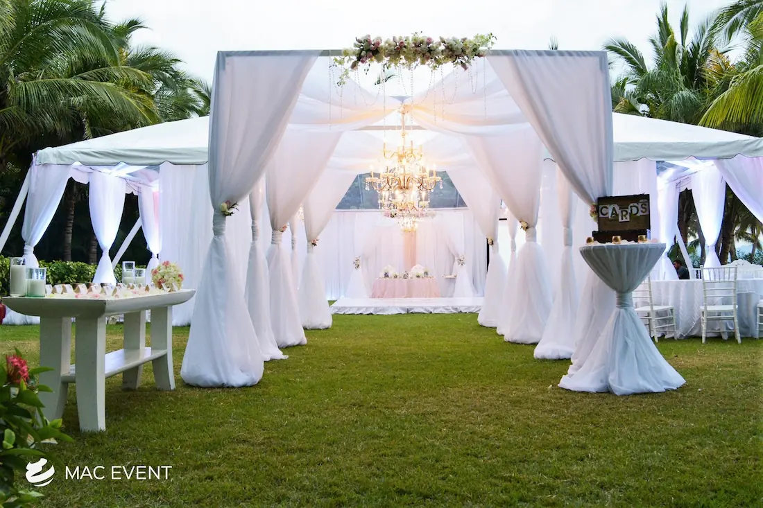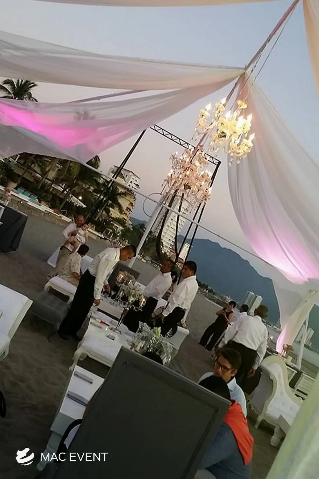 The tent draping adds elegance and softness to weddings, parties, and corporate events in Mexico. Designed to enhance any event tent rental, this decorative fabric transforms the structure into a luxurious and inviting space. Perfect for beach receptions, garden dinners, or formal celebrations, tent draping creates a refined atmosphere while complementing your color palette and theme. Renting tent draping in Mexico ensures professional installation and a cohesive, polished presentation. For a sophisticated and romantic touch that elevates your event décor, the tent draping is a beautiful addition to any setup.